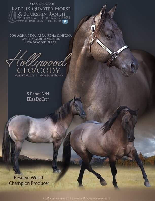 Hollywood Glo Cody is Registered AQHA, IBHA, NFQHA, and FQHA. Less than 5% of all Quarter Horses are Grullo's. "Cody" is 91% Foundation and is registered and approved for APHA and Appaloosa, and is 5 Panel N/N. This gorgeous stallion is not only well built, but also has an extremely quiet & sweet & very quiet disposition. He is a Reserve Champion halter producer, and his babies are great minded, pretty headed, and easy to teach. We are expecting 3 foals from him in 2017 as we purchased him late in the summer of 2016. Cody is 15.1 hands and weighs 1250#. Considerations for multiple mare and proven mares.
